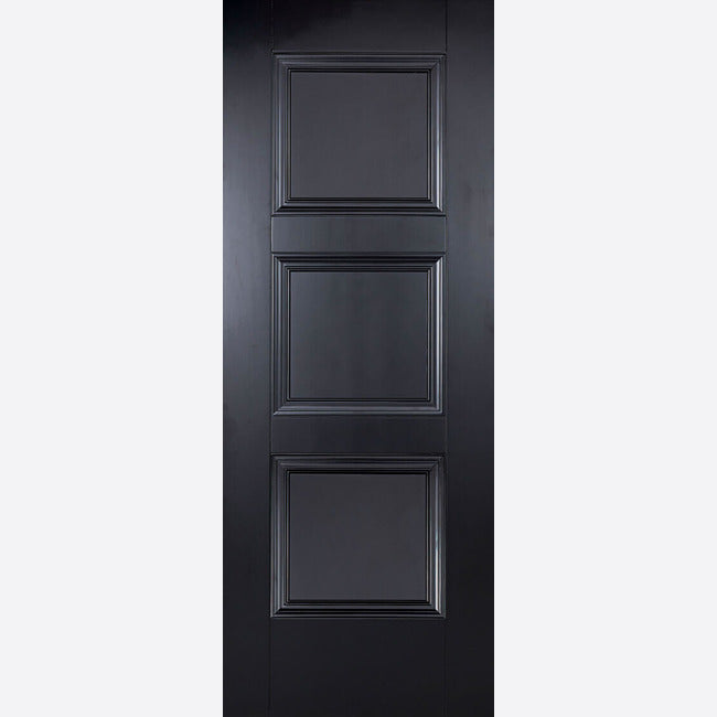 The traditional three panels of this door design is highlighted by a sophisticated primed black finish.