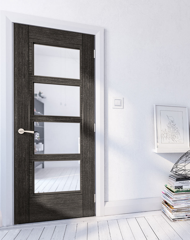 This contemporary design showcases four horizontal panes of clear toughened glass, which beautifully complements the natural grain of the ash veneer. The rich grey tone enhances the visual appeal, adding depth and sophistication to any space.