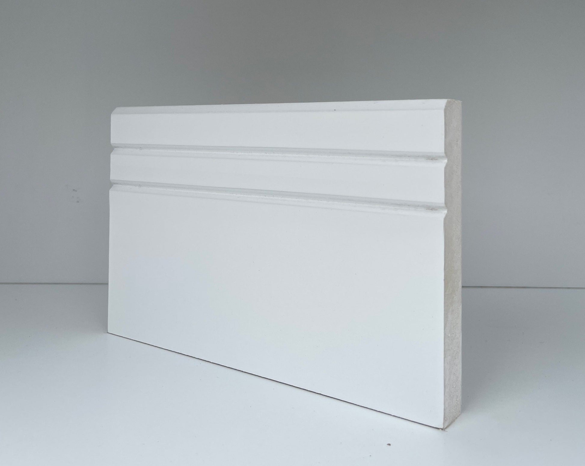 Our Double V Groove is one of the most popular designs. It's contemporary look is perfect for modern environments. Our skirting and architrave is white primed, and will require a final coat of paint. There is no need to worry about cracking or knots appearing with MDF. With a wide range of sizes you can choose the right height to suit your space.